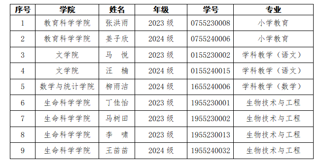 根据《省教育厅关于做好2025年普通高校国家奖学金国家励志奖学金有关工作的通知》(苏教助函〔2025〕5号)及学校相关文件精神,经研究生自愿报名,各培养学院初评和公示,学校研究生奖助学金评审工作组评审,拟推荐以下9位同学作为我校2025年研究生国家奖学金获得者,现予以公示(名单见文末表格)。