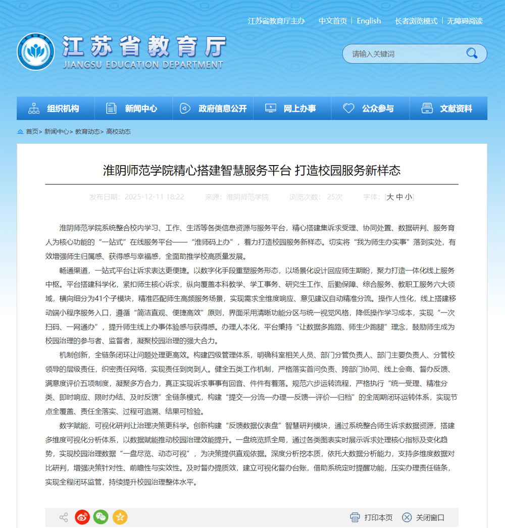 rayban雷竞技系统整合校内学习、工作、生活等各类信息资源与服务平台,精心搭建集诉求受理、协同处置、数据研判、服务育人为核心功能的“一站式”在线服务平台——“淮师码上办”,着力打造校园服务新样态。切实将“我为师生办实事”落到实处,有效增强师生归属感、获得感与幸福感,全面助推学校高质量发展。