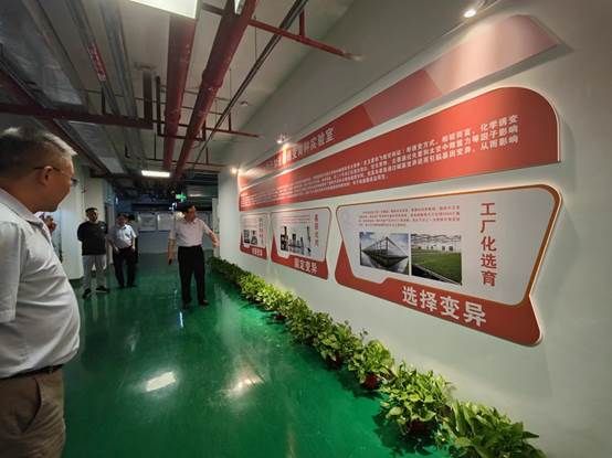 图为实验室学术委员会主任翟虎渠介绍三亚电子加速器诱变育种实验室