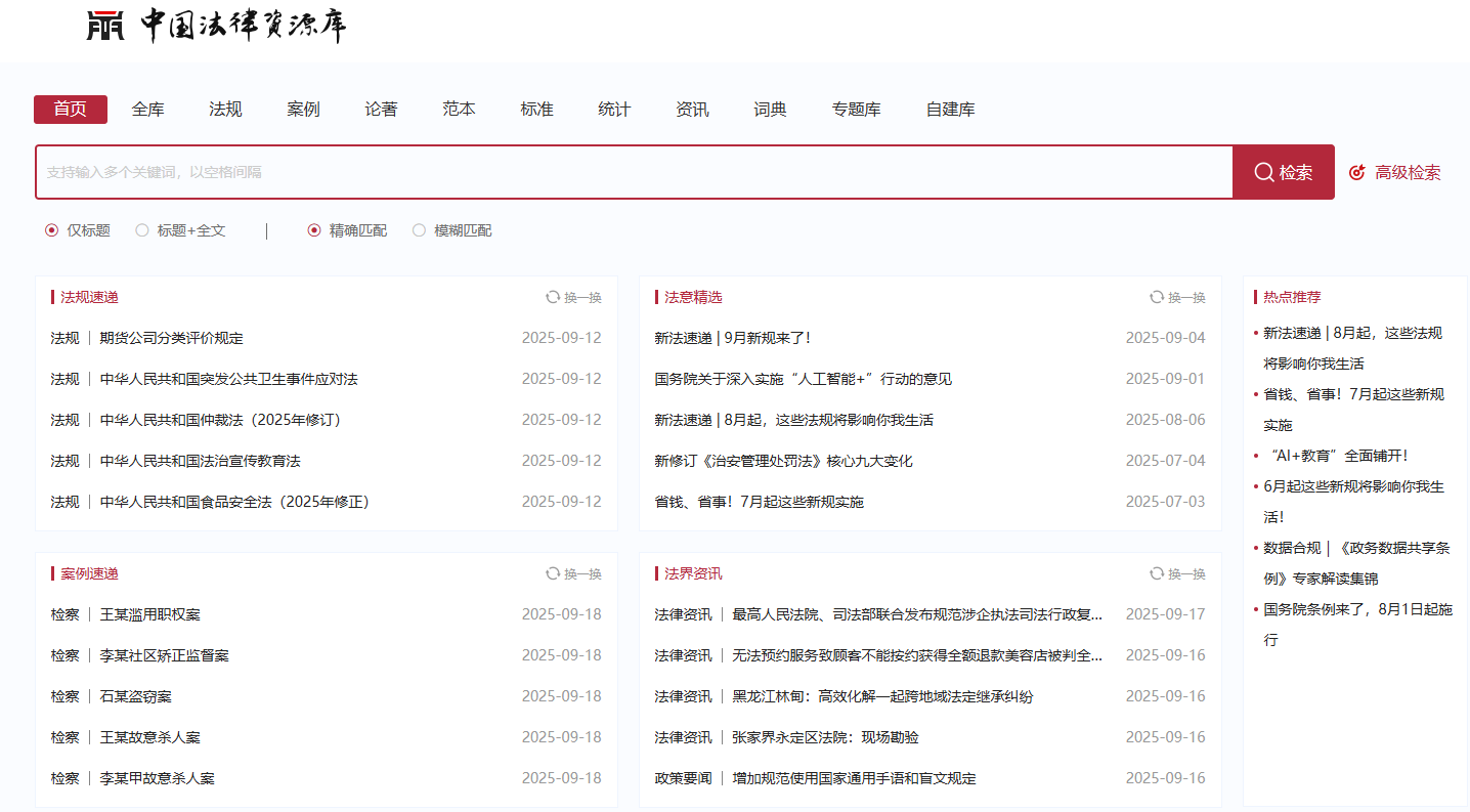 中国法律资源库是法意科技为高校量身打造的集教学、科研为一体的专业化支持服务平台。资源库汇聚12个大类30+子类的法律资源。涵盖法规、案例、执法、论著、合同、文书、标准、制度、统计、资讯、词典、精选,网罗法律检索全面、权威的数据信息。通过该库可以实现资源的相互关联、互相配套;省时省力获得完整的法律资源检索,帮助构建全面、完整的法律知识体系。