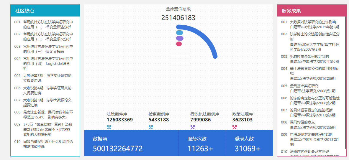平台根据法律院系及专业科研机构的实证分析需求,以司法案例数据库、法律法规数据库和非正式规则数据库为数据来源,为研究者提供课题创建、样本维护、变量设置、统计分析、成果发布等大数据在线服务。平台提供实证分析方法、统计分析工具,能够帮助学生更好地理解法律现象。
