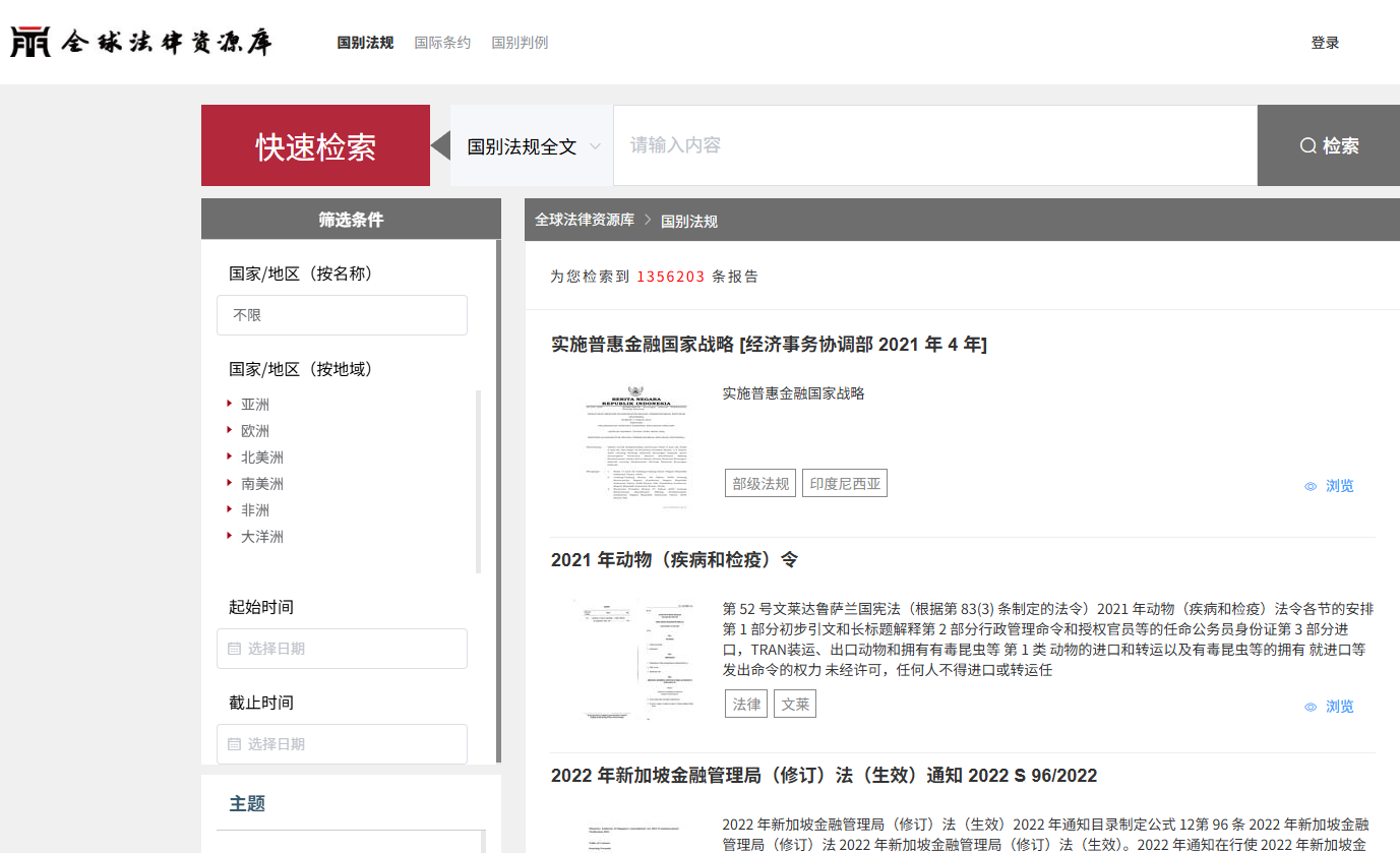 全球法律资源库提供中英两版应用服务,数据库汇集4万+部国际条约、超100个国家外国法规数据,提供便捷检索工具,原语言、中文、英文版法规全文及关联资料,便于用户精准检索与便捷化阅览。
