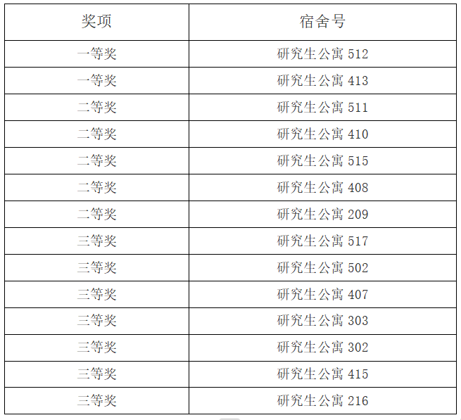在研究生文明宿舍创建活动中,经研究生个人申请、研究生会成员、研究生代表等组成的评比小组进行多次随机现场检查,按量化指标表打分,最终评选出一批成员之间团结友爱、卫生状况好、无违章用电、无其他违纪行为的宿舍,根据《关于开展2024年研究生文明宿舍评选活动的通知》,拟确定研究生公寓512等2间宿舍获一等奖,研究生公寓511等5间宿舍获二等奖,研究生公寓517等7间宿舍获三等奖。