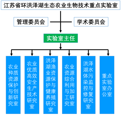 内部结构按主要研究任务设置,下设农业种质资源保护与创新研究室、农业优质高效安全生产技术研究室、洪泽湖渔业资源保护与健康养殖研究室、农业资源综合利用与加工研究室和洪泽湖水体污染监控与修复研究室。