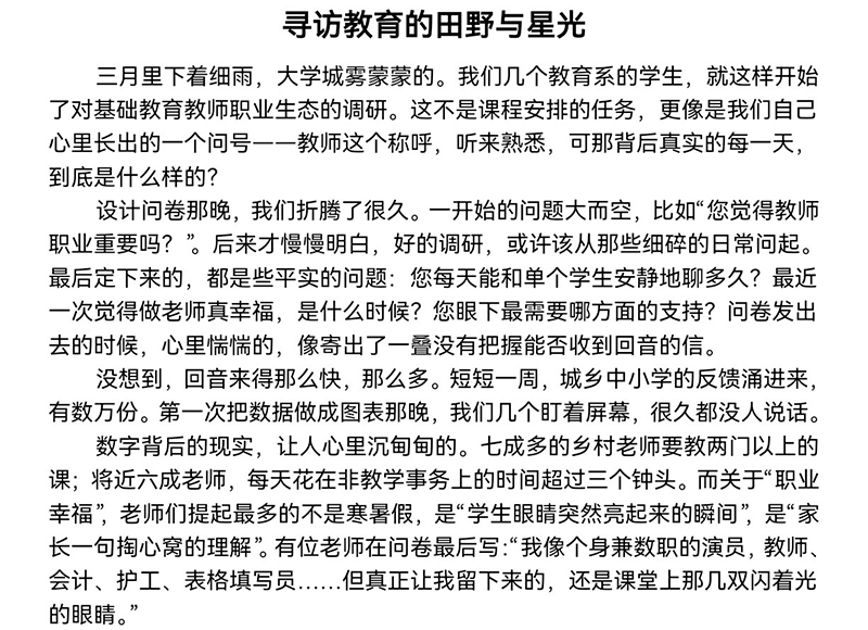 同学们积极参与,其中优秀作品代表:PPT作品如《恪守师者初心,点亮山区童心》,以山区教育为核心视角,分板块呈现职业初心、能力成长路径与山区支教实践规划,以张桂梅的事迹为精神锚点,搭配真实影像与温情文字,让教育职业理想具象化、有温度。征文作品如《寻访教育的田野与星光》,以教育调研为叙事主线,记录走访乡村学校、访谈一线教师的亲身经历,结合调研数据与个人感悟剖析乡村教育发展现状,同时明确自身投身基础教育的职业成长方向,文字兼具调研的严谨性与教育的人文温度。