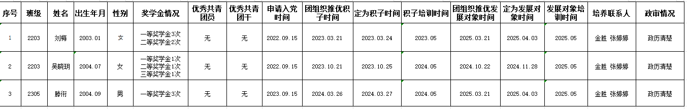 经本人申请,党支部教育、培养和考察,历史文化旅游学院党委预审会同意,现对近期拟接收为中共预备党员的人选进行公示。公示时间:2025年5月26日—2025年5月30日。