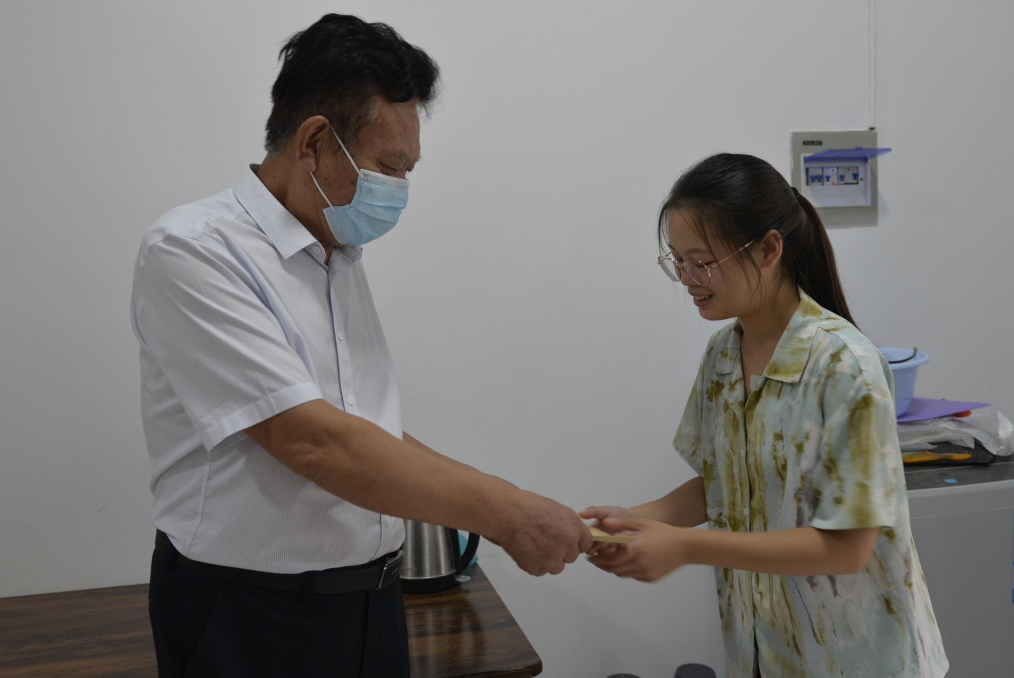时名早仔细询问了严慧同学暑假及返校后的生活、学习情况,着重关注了严慧的专业课学习进度、效率和效果,鼓励其抓好学习的每一步,积极主动向任课老师请教。周海晏从学习规划、职业生涯规划等方面指导严慧同学认真学习,争取未来实现升学或高质量就业。时名早和周海晏共同向严慧同学转交了历史学院关工委的慰问金和慰问品。