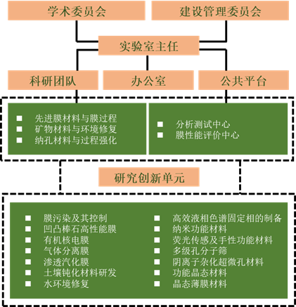 目前实验室共有固定人员51名,实验室组建的研究单元涵盖材料学、膜科学与技术、环境工程和化学化工等学科,各研究方向的学术带头人年龄均在45岁左右,研究人员均拥有博士学位。实验室实行依托单位领导下的主任负责制,设有管理办公室,建有科研团队和公共平台,科研团队包括:先进膜材料与膜过程团队、矿物材料与环境修复团队和纳孔材料与过程强化团队;公共平台由分析测试中心、膜性能评价中心和标准化研究中心组成。同时,建有14个科研创新单元,依据不同学科背景和研究特色而组建,对于通过顶层设计而进行重大课题研究具有重要作用。