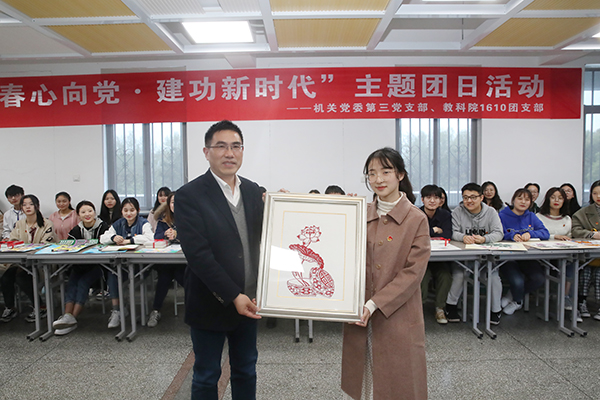 图为教科院1610团支部向焦富民赠送刻纸作品。 记者 唐瑀 摄